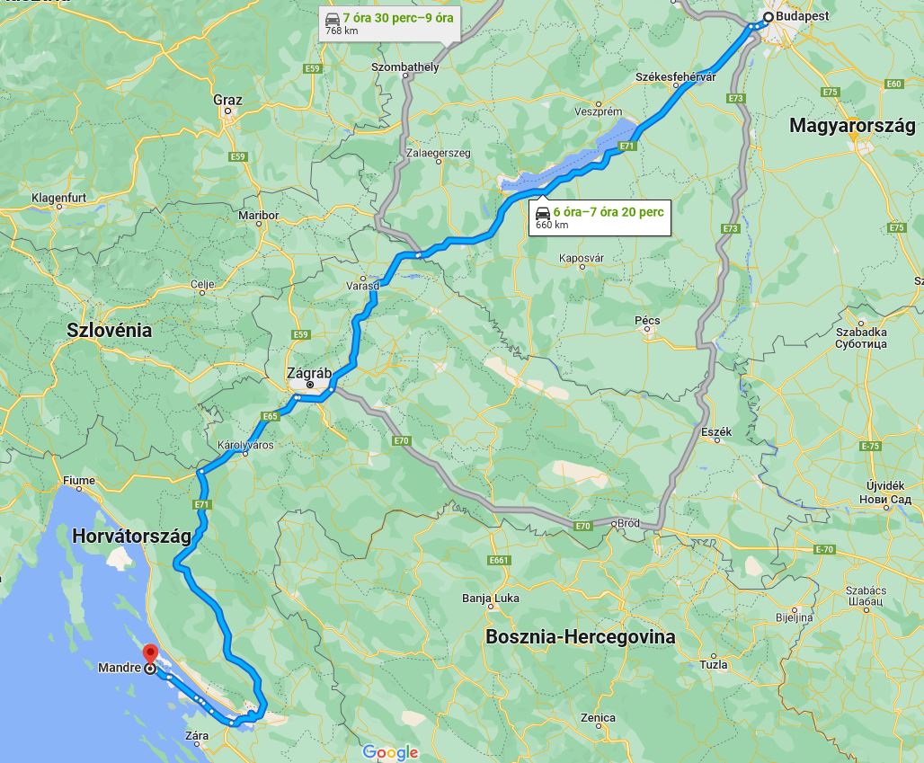Mindkettő esetben az M7-es autópályán célszerű elhagyni Magyarországot a Letenyei határátkelőnél, innen Gorican- Zagreb útvonalon kell haladni az A4-es autópályán. A zágrábi elkerülő szakaszon nagyon kell figyelni és a Split útirányt kell tartani. Zágráb után Karlovacot elhagyva a Split felé vezető A1-es autópályán kell tovább menni. Az autópálya első nagy alagútja a több mint öt kilométeres "Mala Kapela" és a Brinje lehajtó elhagyása után választhatunk a gyorsabb és kényelmesebb, valamint a vadregényes kompátkeléses útvonal között.