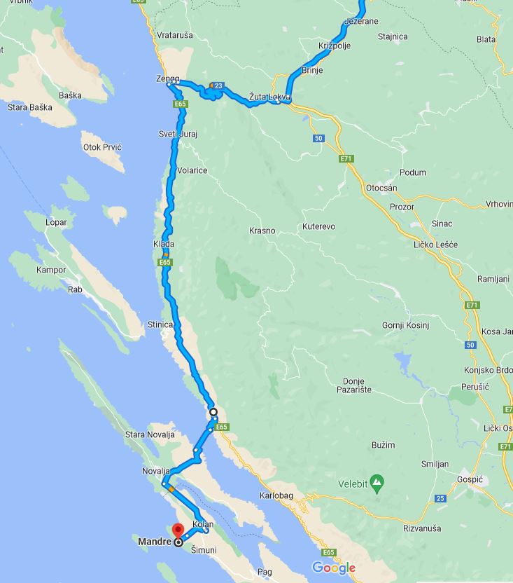 A vadregényes megközelítés választása esetén "Brinje" után a "Senj-i" útvonalon elhagyjuk az autópályát és csodálatos, hegyek között kacskaringózó úton érünk be a tengerparti Senj városába. Innen csaknem egyórás úton, a filmekbe illő tengerfeletti szerpentineken haladunk tovább Rab-sziget felé, majd azt elhagyva "Prizna" helyiségben térünk le az útról a "Pag-i" kompkikötő irányába. Húszperces kompátkelést követően "Pag" útirányt tartva, "Kolan" helyiségnél térünk le az útról jobbra, ahol már látjuk a Mandre felé vezető útjelző táblát.